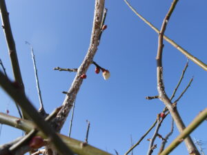 家の周りを観察してみると、庭にある梅の木のつぼみが一つだけ開いていました。