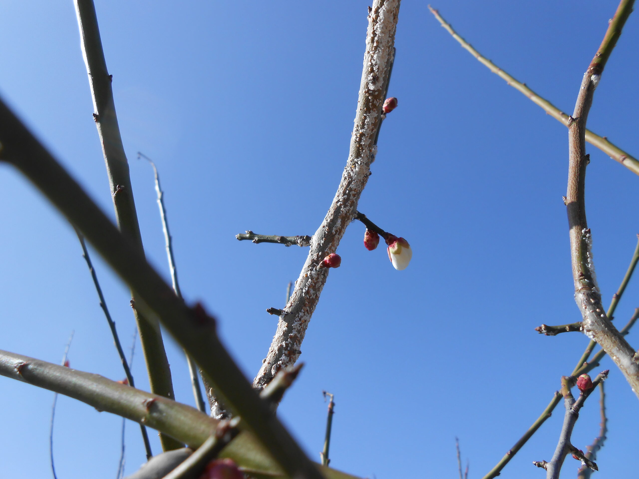 家の周りを観察してみると、庭にある梅の木のつぼみが一つだけ開いていました。