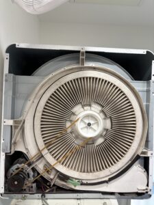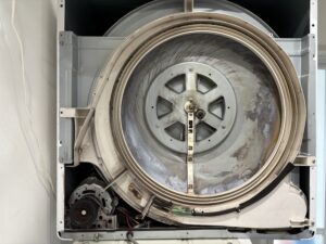 今回のトラブルは、送風ファン側のプーリーの中央の穴とその中心部の軸の両者が摩耗してガタが出たため送風ファンがぶれて本体に接触し、音が出ていた。