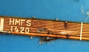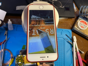 5mm幅くらいのなかに9本の配線が施されているため、線が細くて線間が狭く、肉眼では見えないので、スマートホンの拡大鏡アプリを使って作業。
